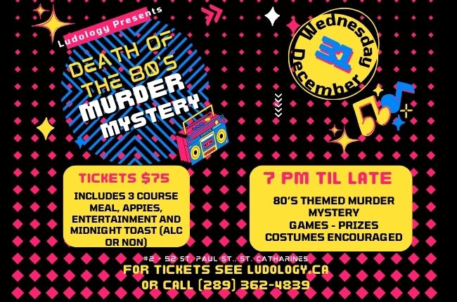 You’re invited to a New Year’s Eve murder mystery night! Join Ludology Boardgame Cafe in the 80’s and solve a crime with friends & family. Includes appies, 3 course meal, midnight toast (alc or non), entertainment, and the satisfaction of resolving a murder. Costumes encouraged!